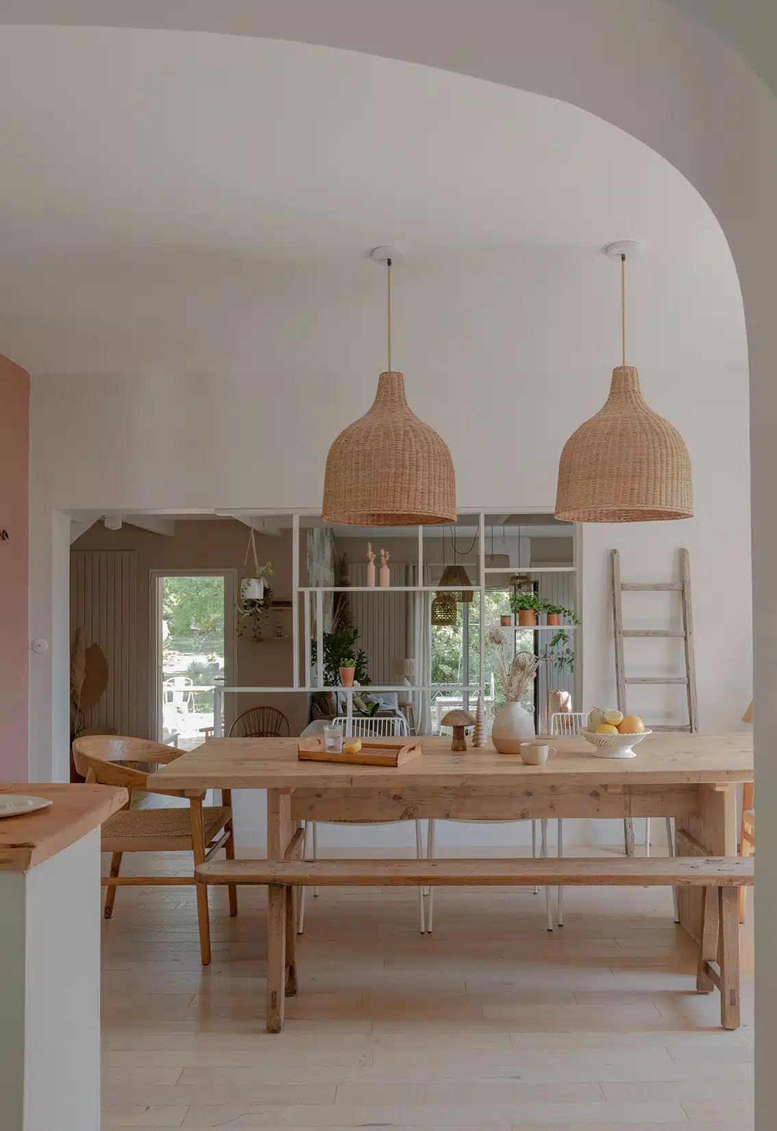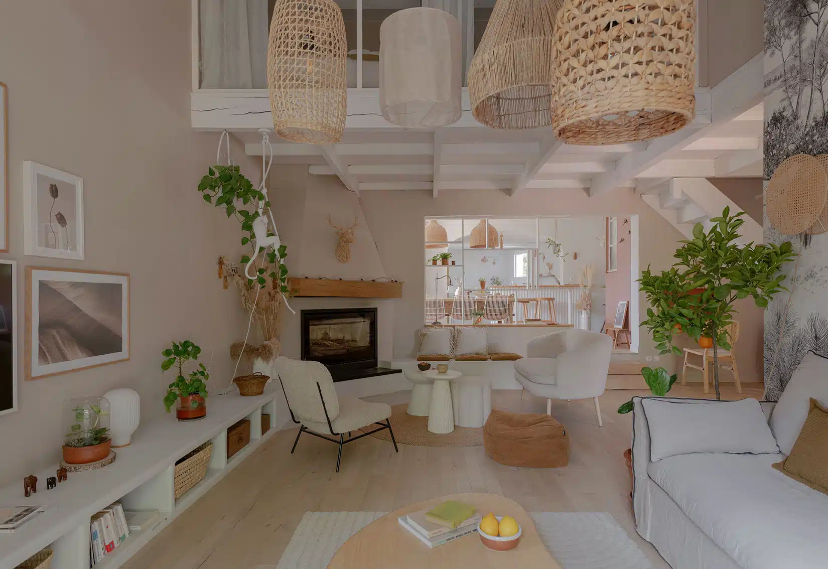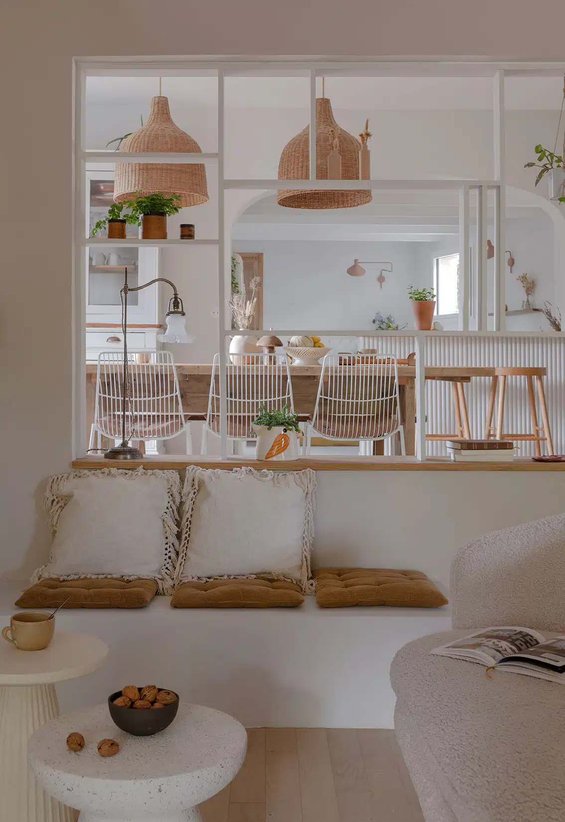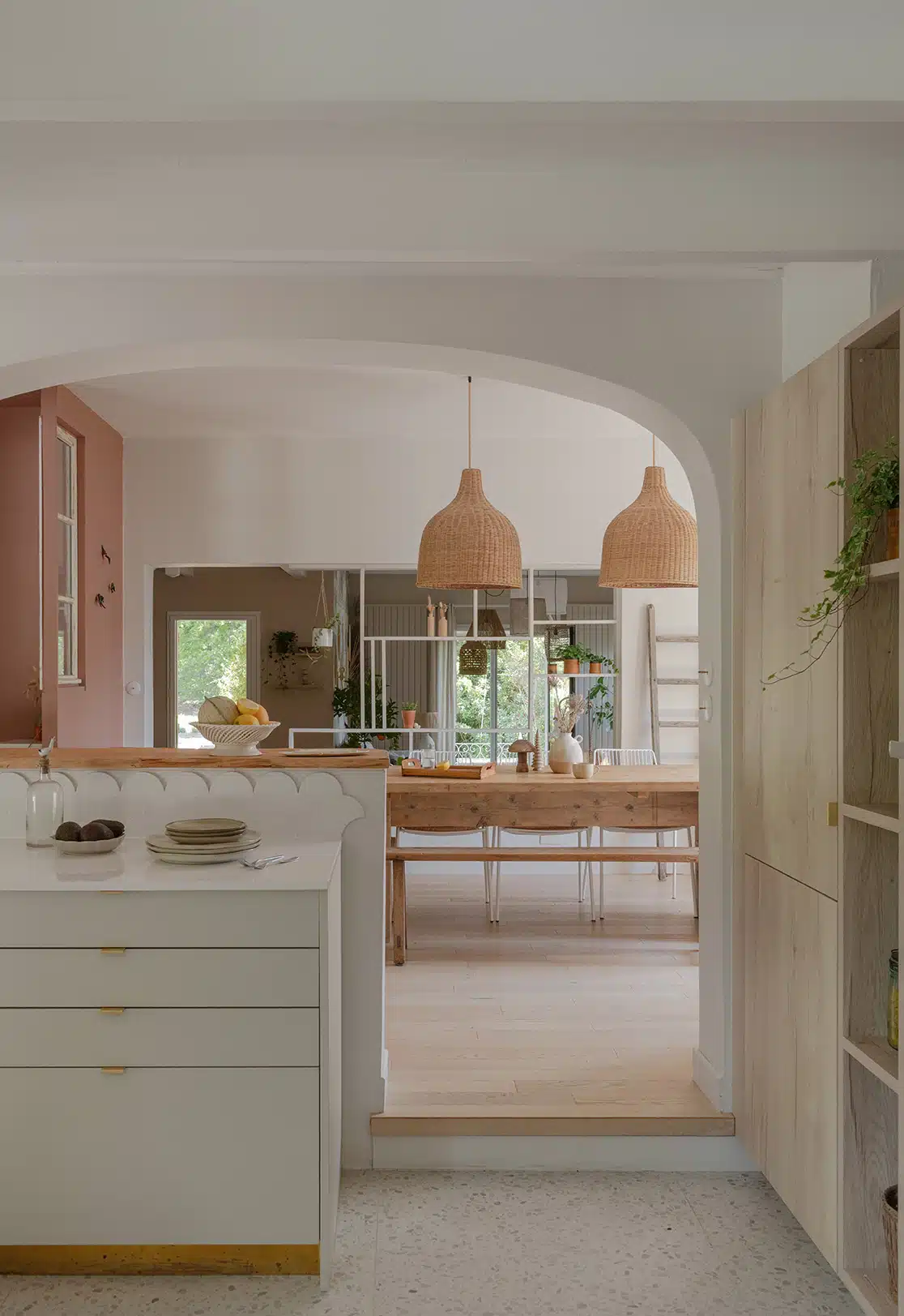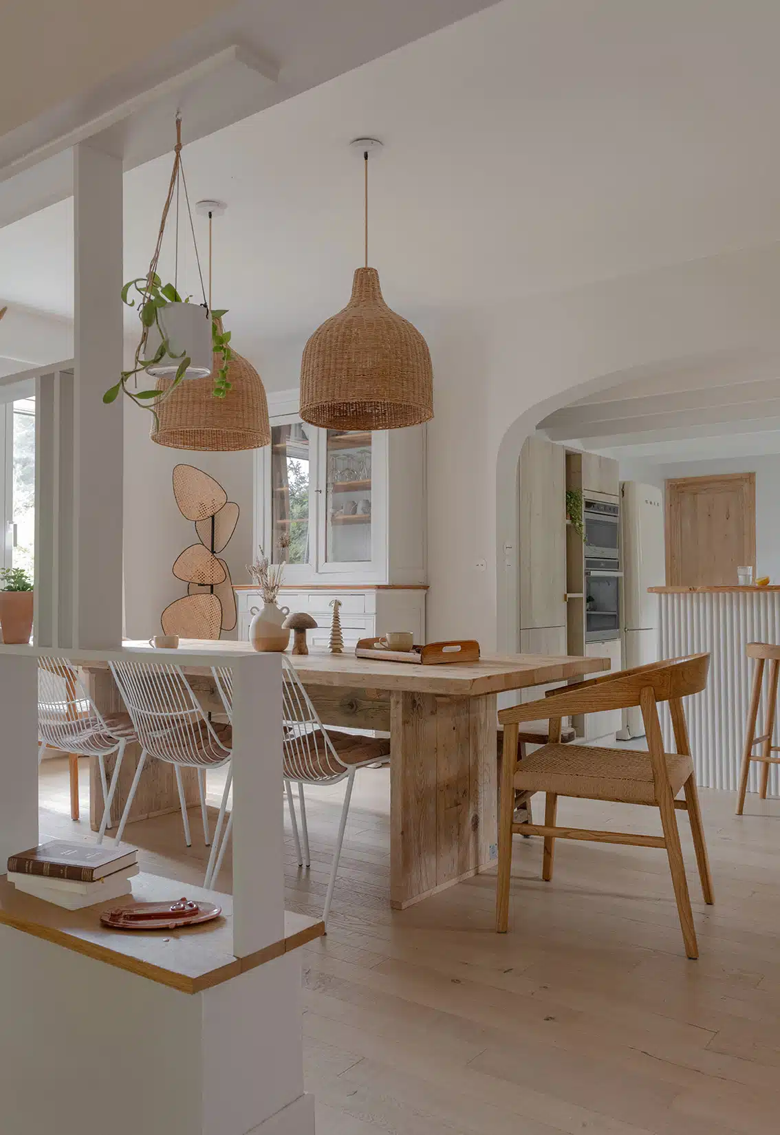 Cette maison des années 70 a été entièrement rénovée, restructurée et repensée pour s’adapter aux besoins d’une famille de quatre personnes. Pensée comme une maison de famille chaleureuse, elle offre aujourd’hui de beaux volumes intérieurs où les espaces de vie s’ouvrent les uns sur les autres afin de laisser circuler la lumière et le regard. La structuration reste atypique, avec différents jeux de niveaux qui viennent naturellement délimiter les fonctions. La grande cuisine s’ouvre ainsi sur un bel espace repas, tandis que le salon, aménagé en L autour de la cheminée, est subtilement séparé du reste des pièces de vie par un claustra dessiné sur mesure, apportant à la fois fonctionnalité et touche graphique. La mezzanine existante a été rénovée et fermée grâce à une verrière atelier blanche réalisée sur mesure, permettant de créer un nouvel espace tout en conservant la luminosité. Enfin, de nombreux éléments chinés viennent ponctuer les espaces et apportent caractère et charme à cette maison de famille. Des touches de couleur et de papier peint viennent habiller subtilement les différents espaces. À l’extérieur, on profite d’un beau jardin et de multiples terrasses, parfaites pour partager de bons moments en famille ou entre amis.