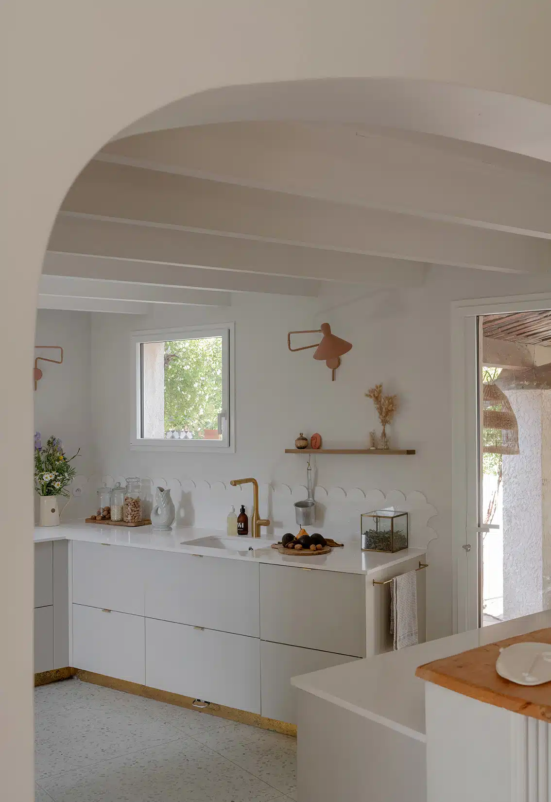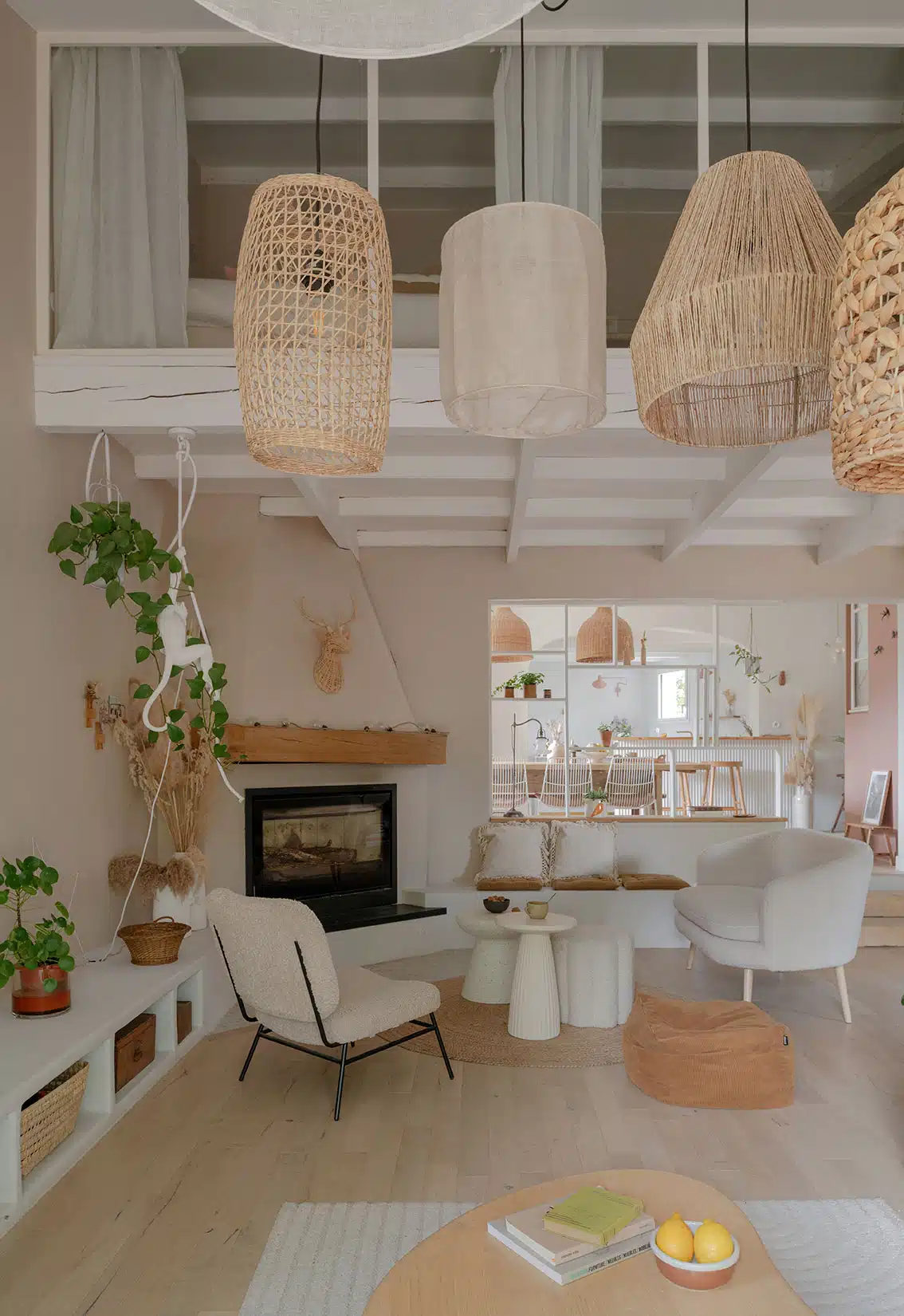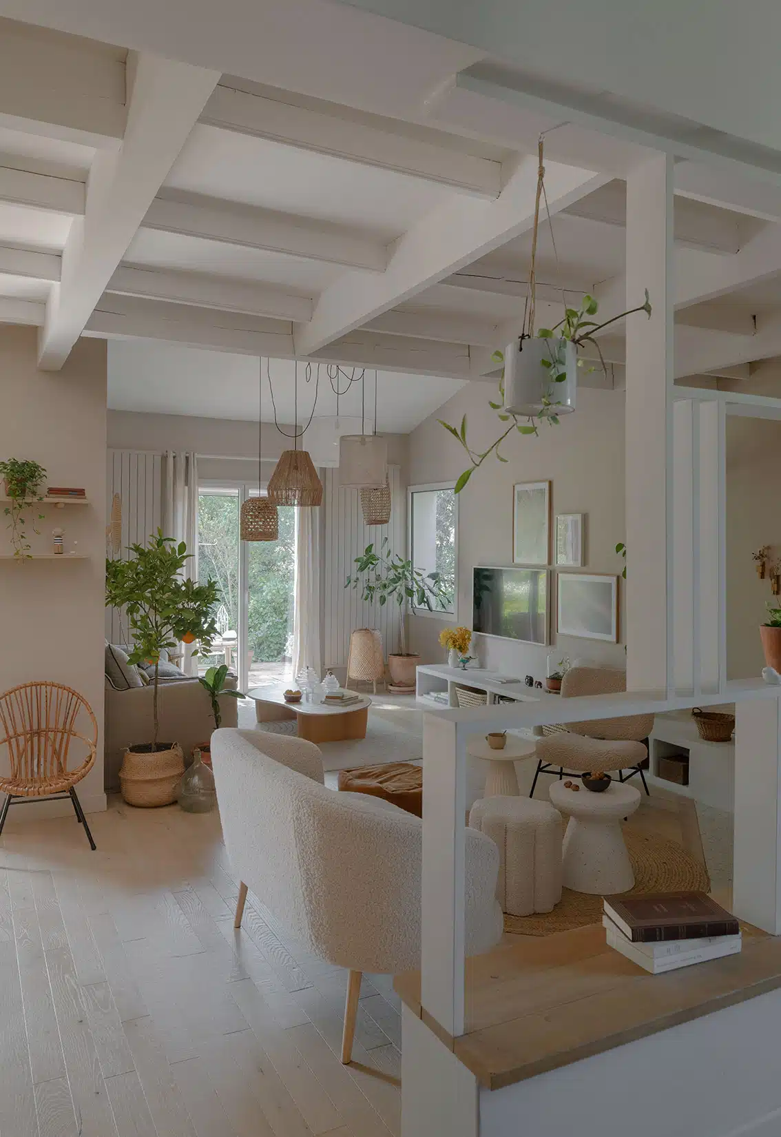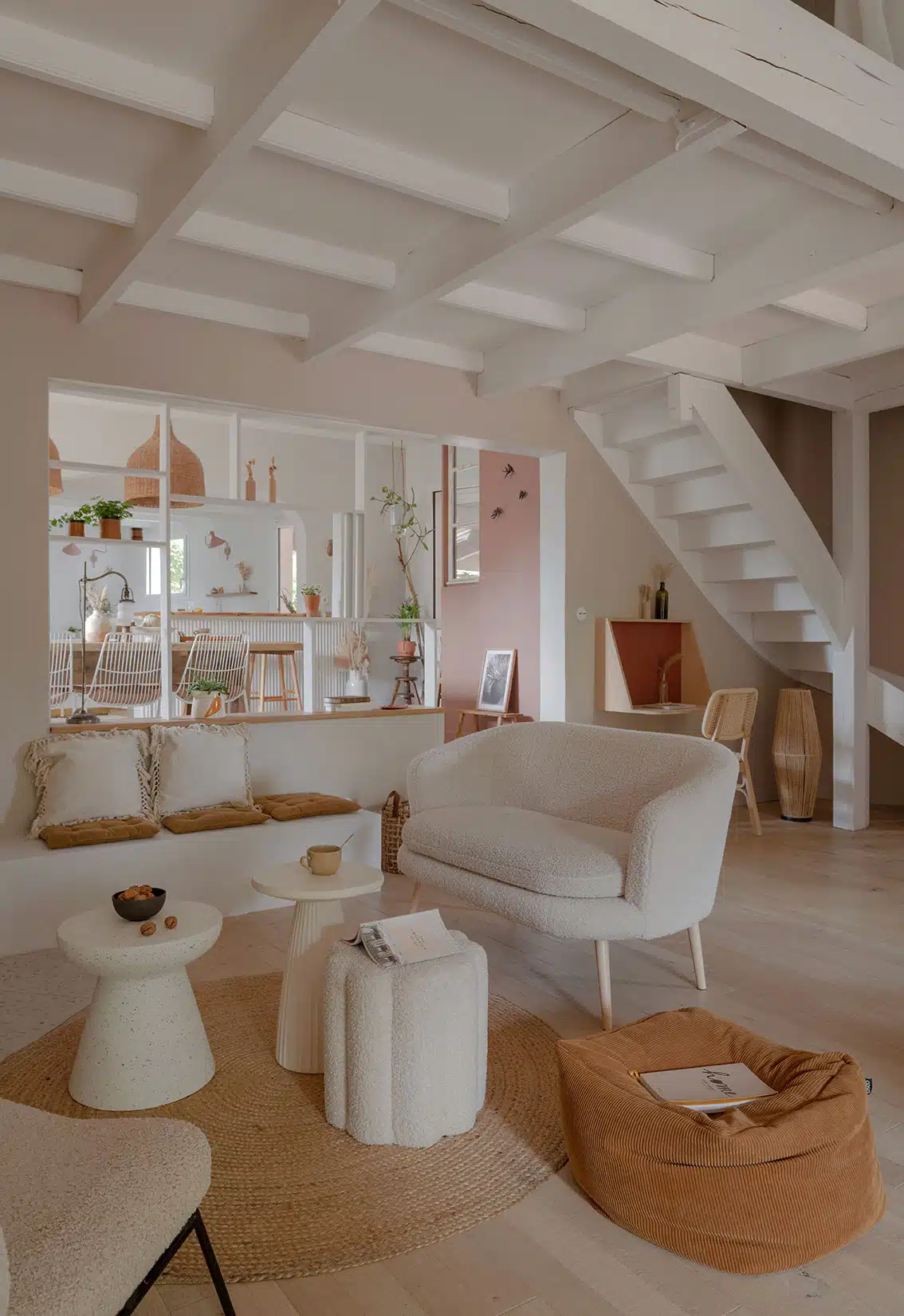 Cette maison des années 70 a été entièrement rénovée, restructurée et repensée pour s’adapter aux besoins d’une famille de quatre personnes. Pensée comme une maison de famille chaleureuse, elle offre aujourd’hui de beaux volumes intérieurs où les espaces de vie s’ouvrent les uns sur les autres afin de laisser circuler la lumière et le regard. La structuration reste atypique, avec différents jeux de niveaux qui viennent naturellement délimiter les fonctions. La grande cuisine s’ouvre ainsi sur un bel espace repas, tandis que le salon, aménagé en L autour de la cheminée, est subtilement séparé du reste des pièces de vie par un claustra dessiné sur mesure, apportant à la fois fonctionnalité et touche graphique. La mezzanine existante a été rénovée et fermée grâce à une verrière atelier blanche réalisée sur mesure, permettant de créer un nouvel espace tout en conservant la luminosité. Enfin, de nombreux éléments chinés viennent ponctuer les espaces et apportent caractère et charme à cette maison de famille. Des touches de couleur et de papier peint viennent habiller subtilement les différents espaces. À l’extérieur, on profite d’un beau jardin et de multiples terrasses, parfaites pour partager de bons moments en famille ou entre amis.