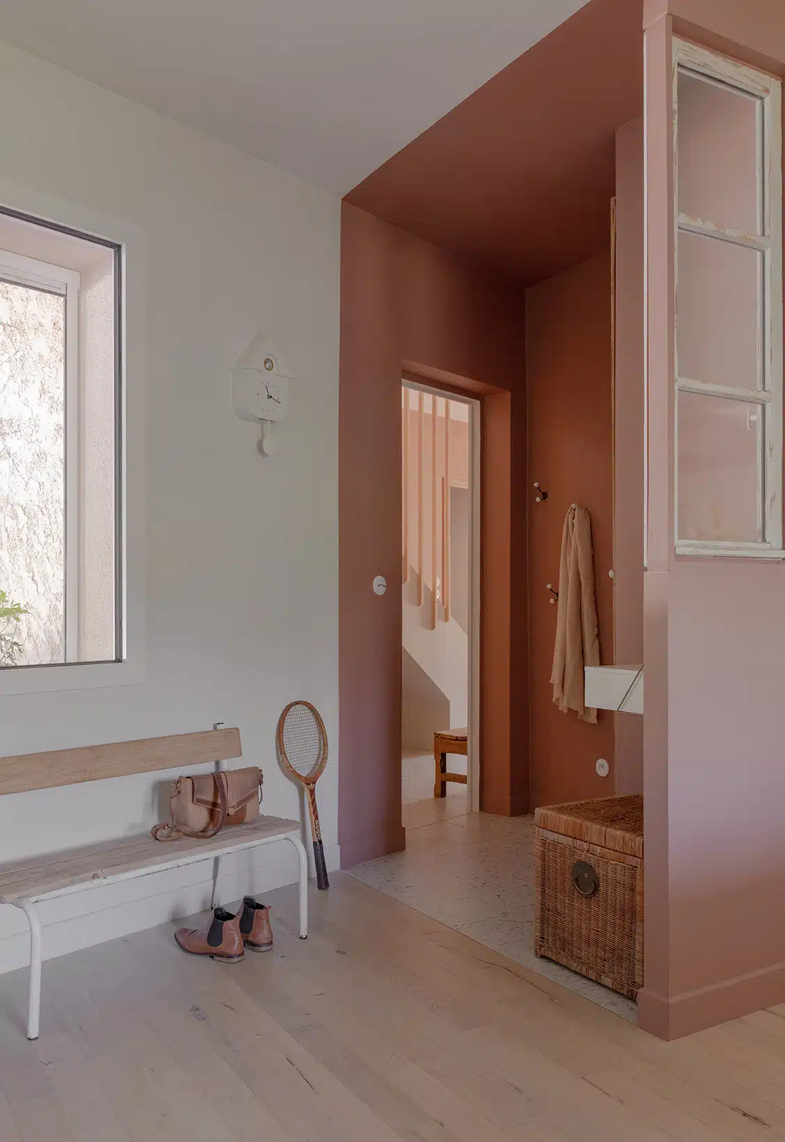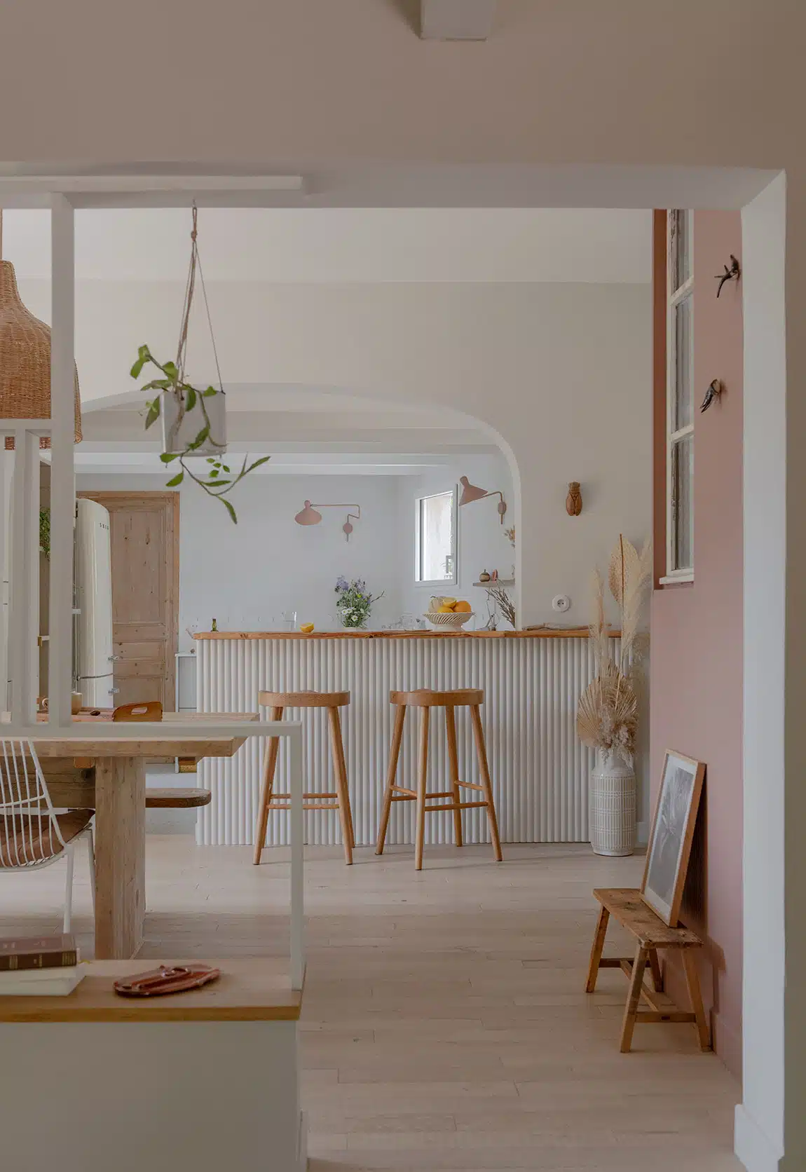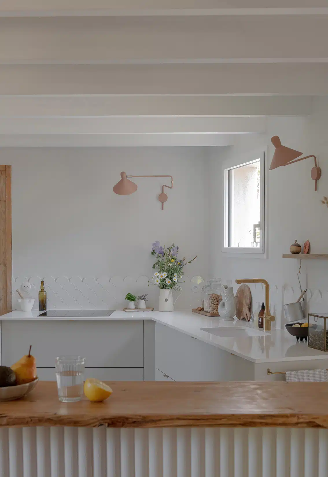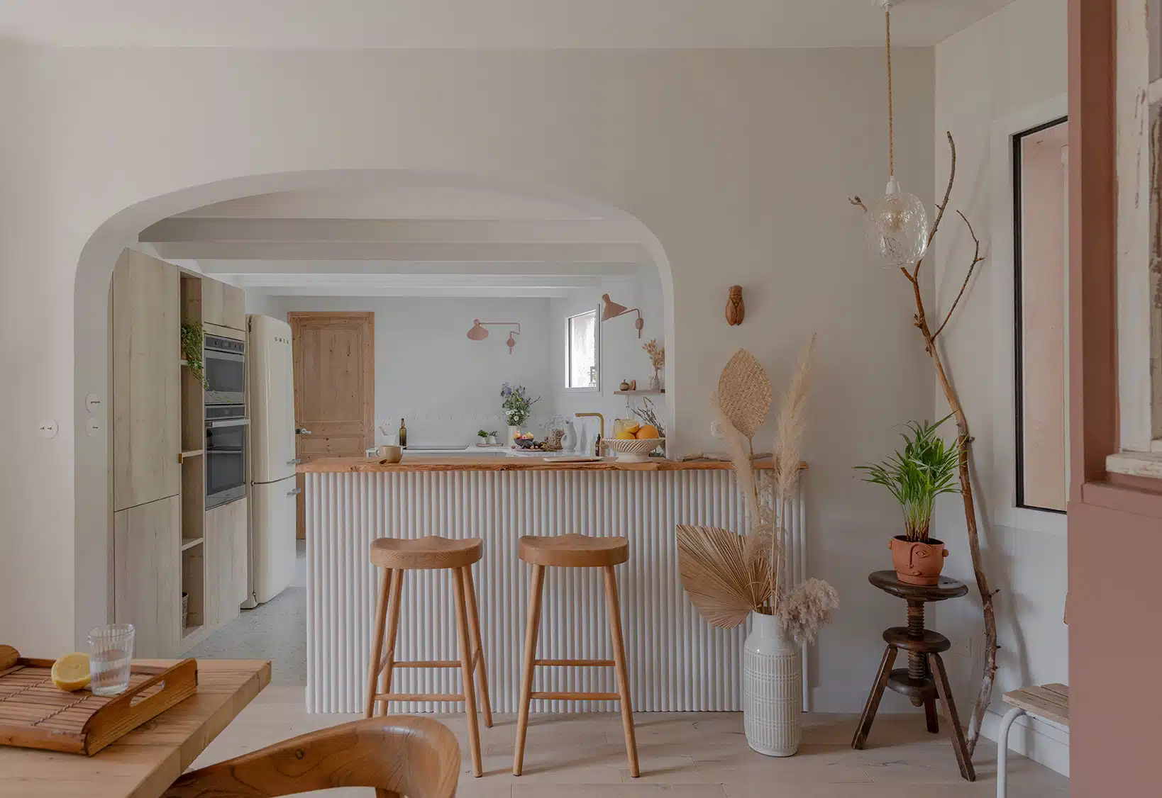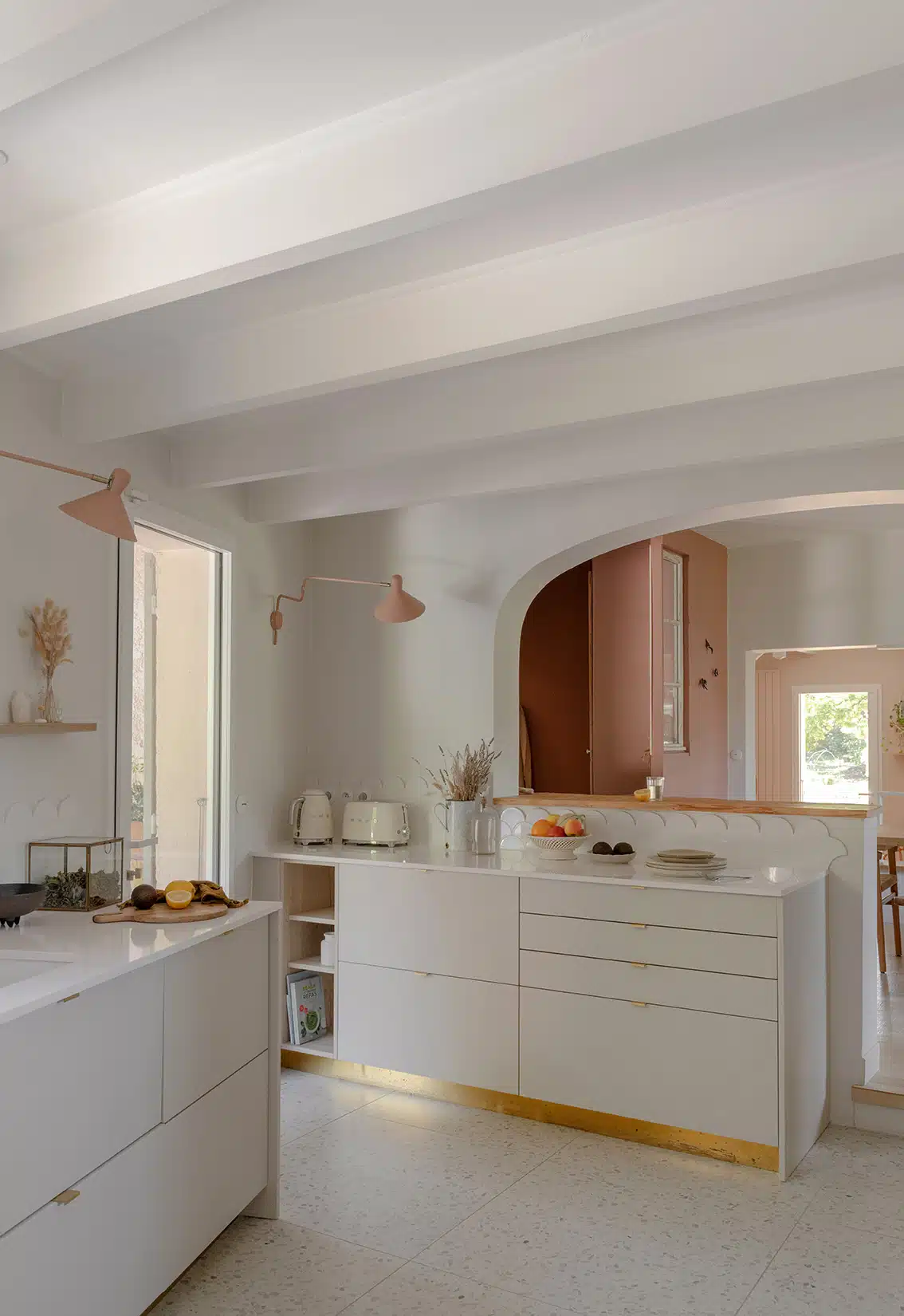 Cette maison des années 70 a été entièrement rénovée, restructurée et repensée pour s’adapter aux besoins d’une famille de quatre personnes. Pensée comme une maison de famille chaleureuse, elle offre aujourd’hui de beaux volumes intérieurs où les espaces de vie s’ouvrent les uns sur les autres afin de laisser circuler la lumière et le regard. La structuration reste atypique, avec différents jeux de niveaux qui viennent naturellement délimiter les fonctions. La grande cuisine s’ouvre ainsi sur un bel espace repas, tandis que le salon, aménagé en L autour de la cheminée, est subtilement séparé du reste des pièces de vie par un claustra dessiné sur mesure, apportant à la fois fonctionnalité et touche graphique. La mezzanine existante a été rénovée et fermée grâce à une verrière atelier blanche réalisée sur mesure, permettant de créer un nouvel espace tout en conservant la luminosité. Enfin, de nombreux éléments chinés viennent ponctuer les espaces et apportent caractère et charme à cette maison de famille. Des touches de couleur et de papier peint viennent habiller subtilement les différents espaces. À l’extérieur, on profite d’un beau jardin et de multiples terrasses, parfaites pour partager de bons moments en famille ou entre amis.