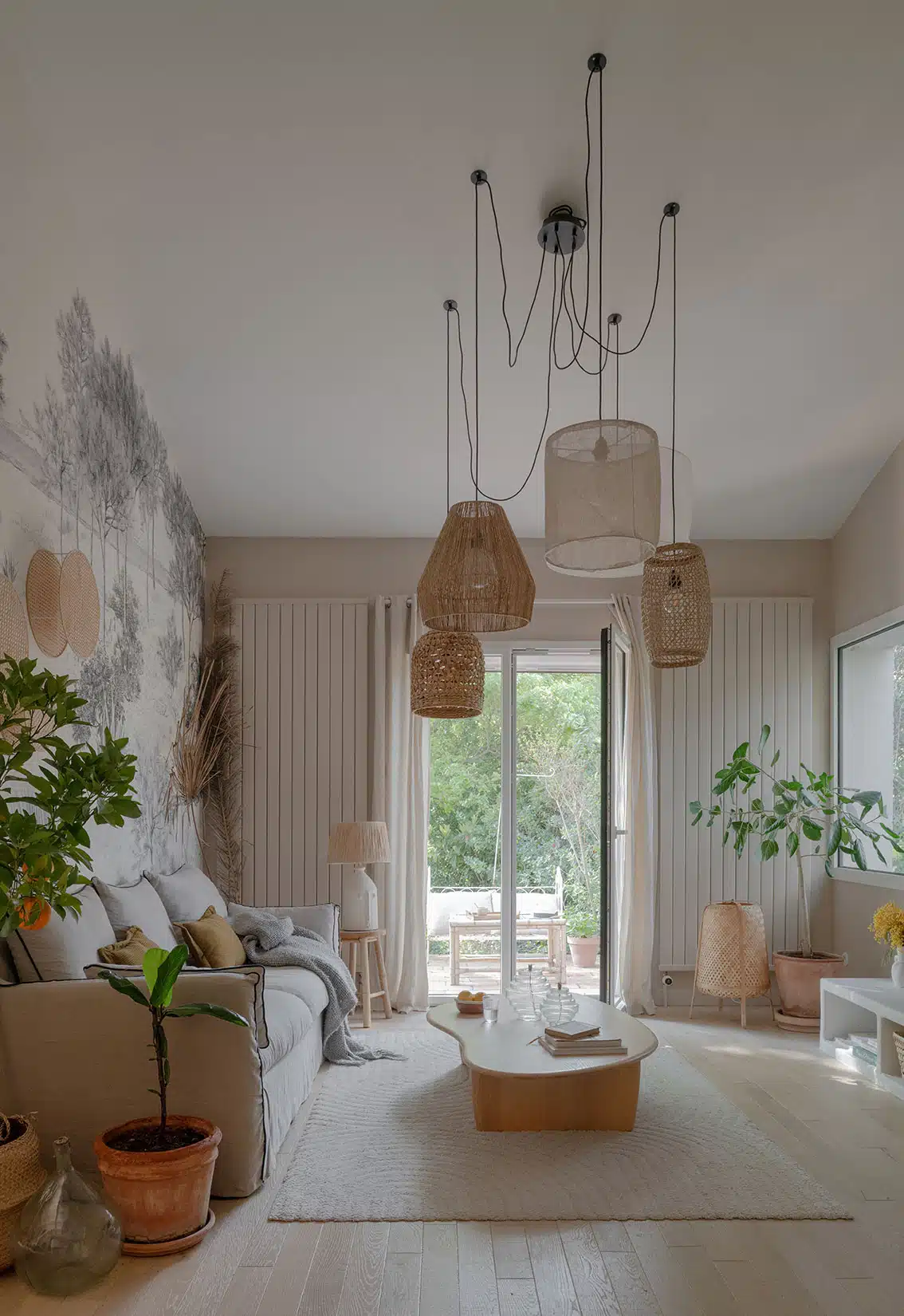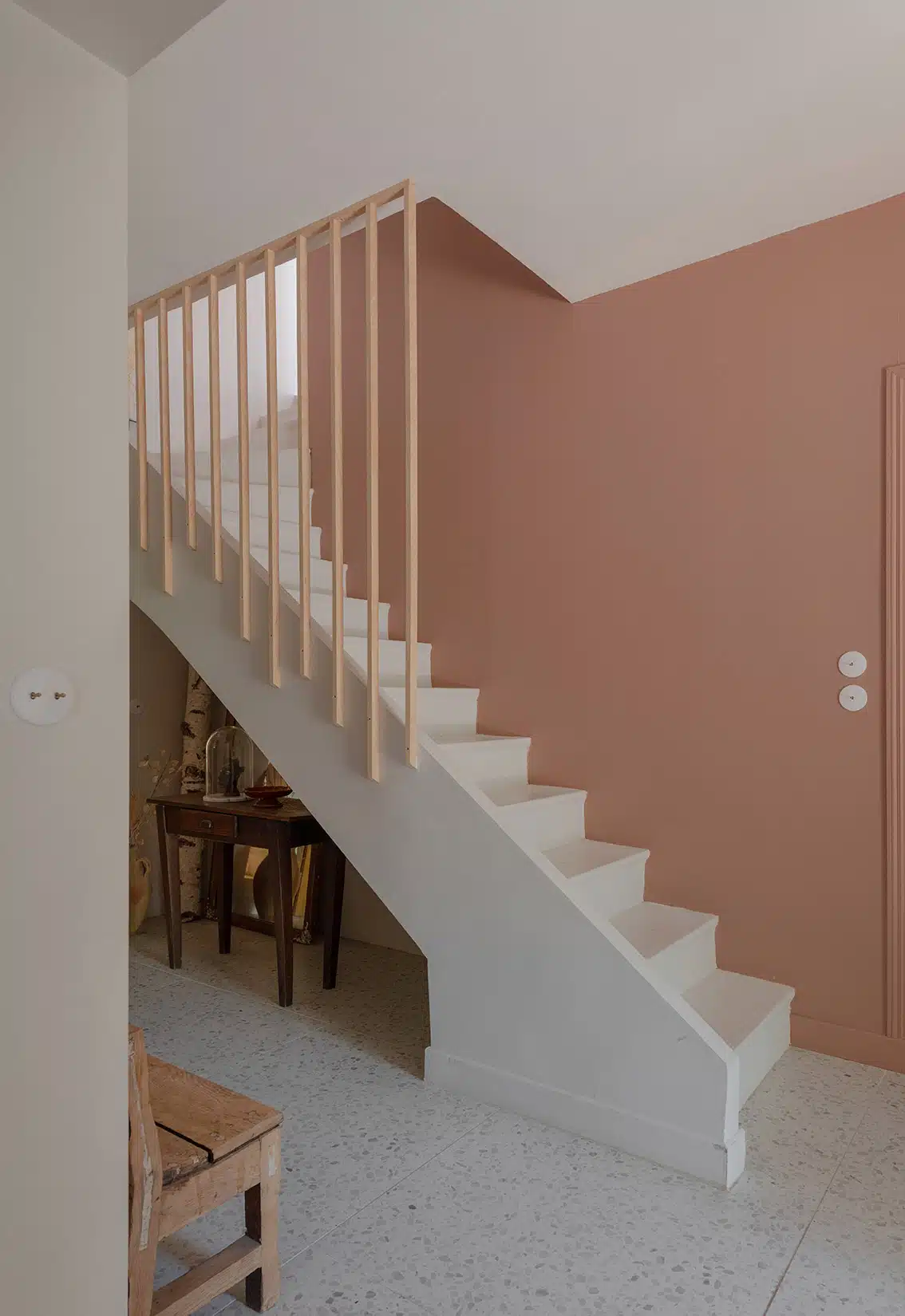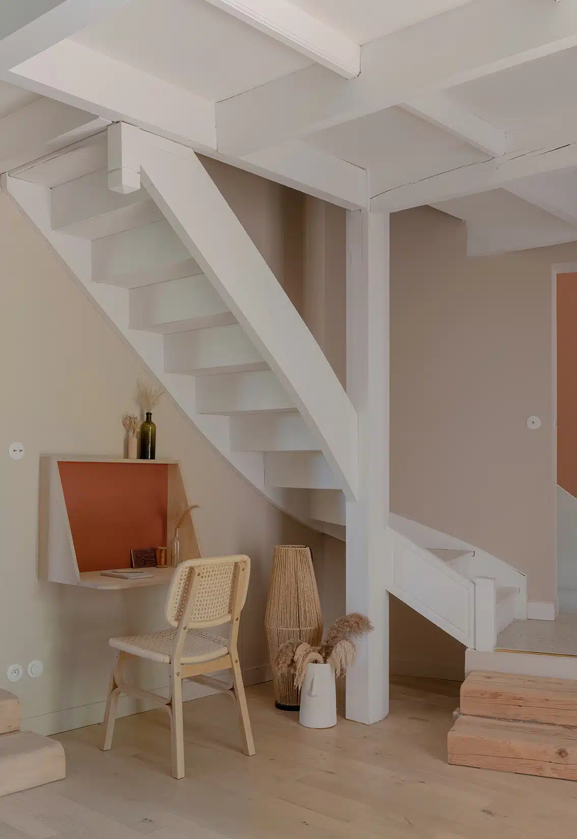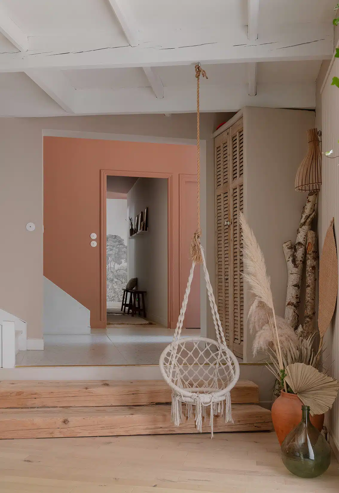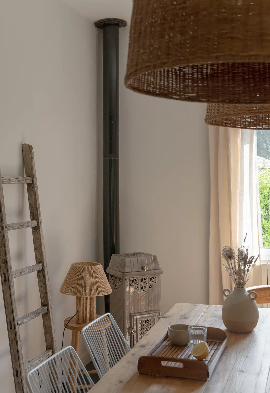 Cette maison des années 70 a été entièrement rénovée, restructurée et repensée pour s’adapter aux besoins d’une famille de quatre personnes. Pensée comme une maison de famille chaleureuse, elle offre aujourd’hui de beaux volumes intérieurs où les espaces de vie s’ouvrent les uns sur les autres afin de laisser circuler la lumière et le regard. La structuration reste atypique, avec différents jeux de niveaux qui viennent naturellement délimiter les fonctions. La grande cuisine s’ouvre ainsi sur un bel espace repas, tandis que le salon, aménagé en L autour de la cheminée, est subtilement séparé du reste des pièces de vie par un claustra dessiné sur mesure, apportant à la fois fonctionnalité et touche graphique. La mezzanine existante a été rénovée et fermée grâce à une verrière atelier blanche réalisée sur mesure, permettant de créer un nouvel espace tout en conservant la luminosité. Enfin, de nombreux éléments chinés viennent ponctuer les espaces et apportent caractère et charme à cette maison de famille. Des touches de couleur et de papier peint viennent habiller subtilement les différents espaces. À l’extérieur, on profite d’un beau jardin et de multiples terrasses, parfaites pour partager de bons moments en famille ou entre amis.
